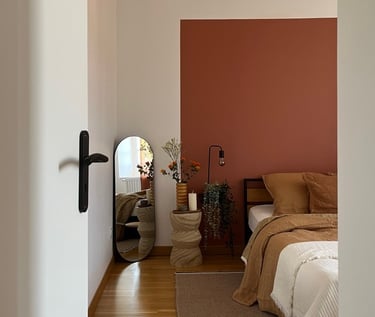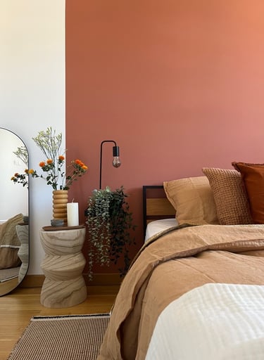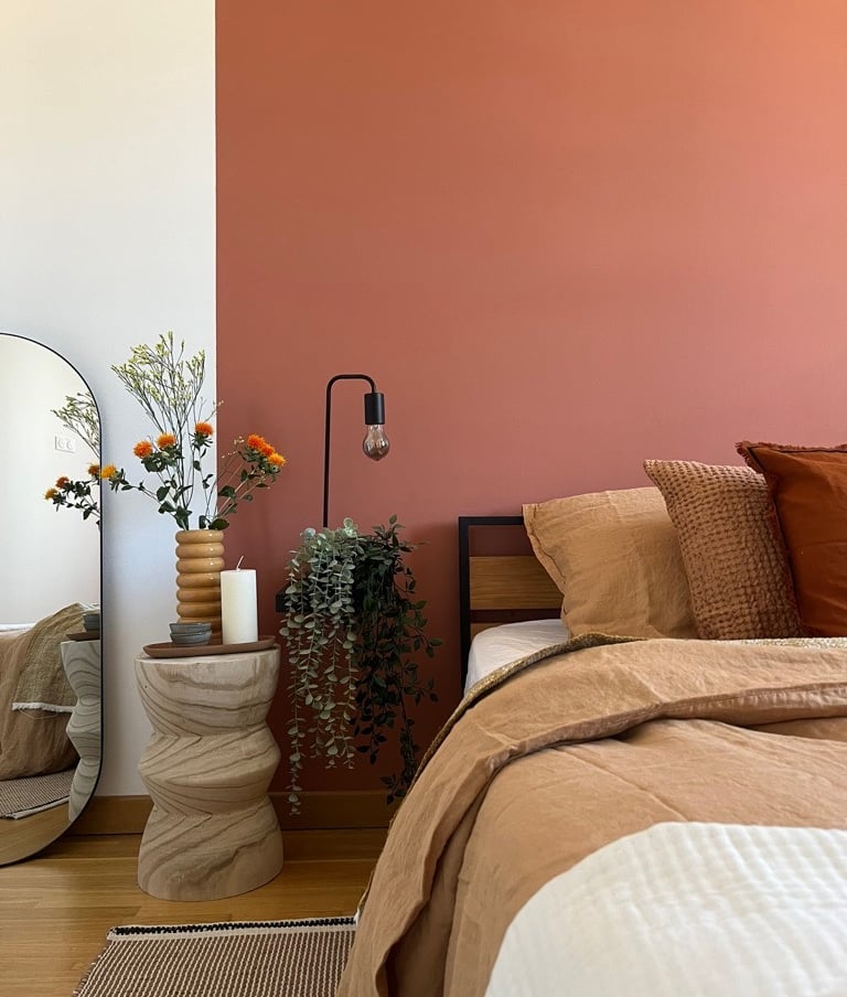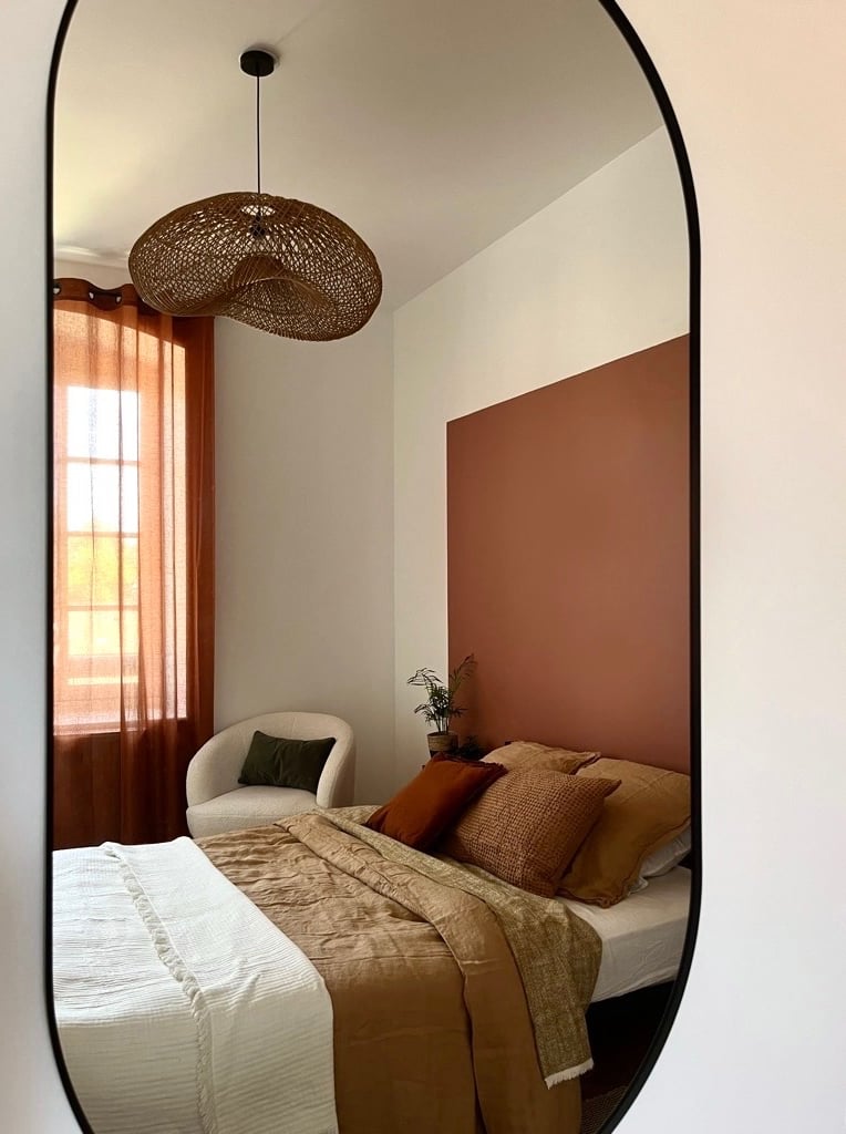 La chambre a elle aussi été traitée avec une tonalité terreuse, toutefois un peu plus affirmée mais toujours en camaïeu avec le reste des matières pour apporter de la douceur et un sentiment de confort dans cet espace nuit. La peinture du mur qui vient encadrer la tête de lit délimite encore une fois l'espace le plus important de la pièce, concentrant le regard sur la zone principale.