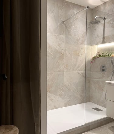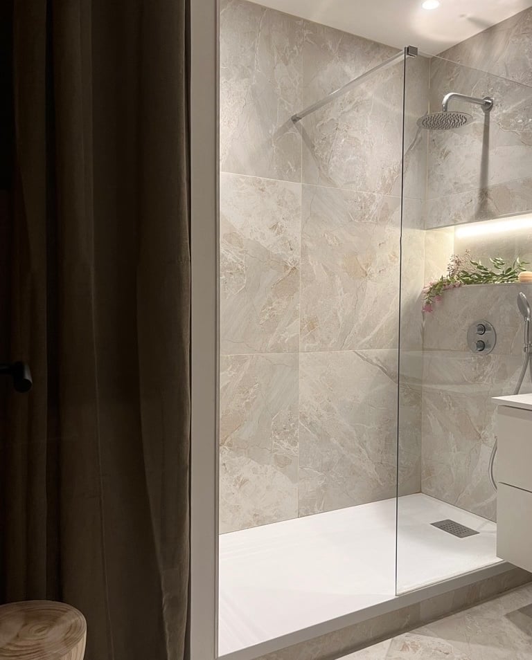 Un total look marbre à la demande du client, mais toujours en douceur avec un veinage de la pierre orangé.