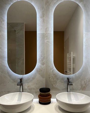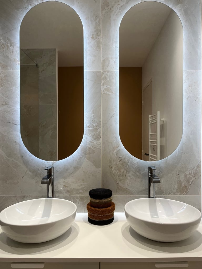 Les miroirs de formes arrondis renforcent la douceur de l'espace et viennent donner plus de profondeur à la pièce créant de nouveau points de vue et apportant de la clarté grâce aux reflets de lumière.
