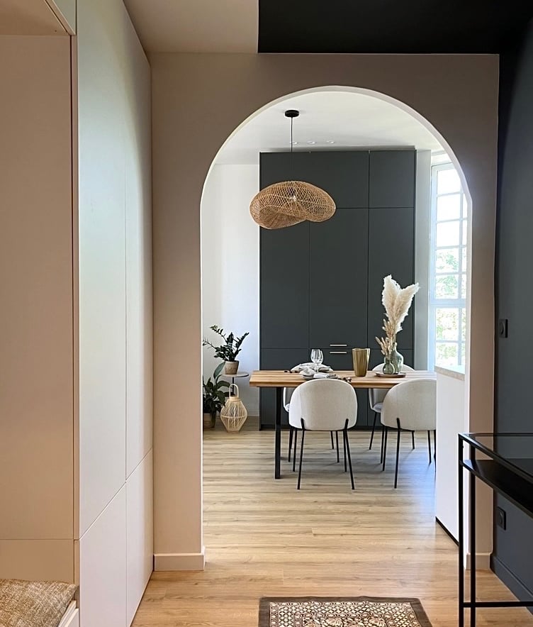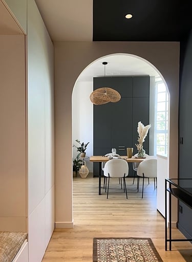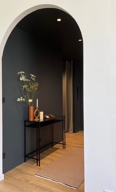 Auparavant un espace de desserte entouré de portes, l'entrée a été repensée pour donner un sentiment plus intimiste en utilisant notamment un vert sombre. Cette délimitation de peinture sert également à isoler les pièces techniques de l'espace nuit, ce qui donne de la fluidité dans les déplacements et l'identification de l'environnement. L'arche qui a été créé structure la vision sur l'espace salon où les teintes sont plus claires, ce qui accentue la luminosité, invitant à s'installer dans la pièce de vie.
