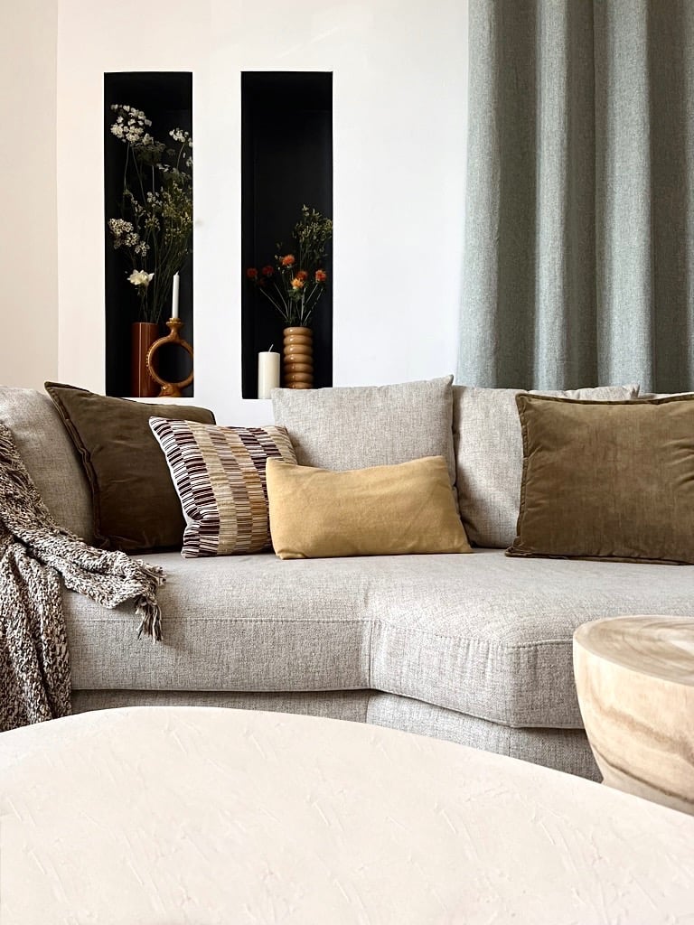 Sur le salon, on retrouve le travail des couleurs avec un rappel du vert sombre dans les niches de décoration et les textures notamment du canapé qui sont semblables aux chaises de la salle à manger.