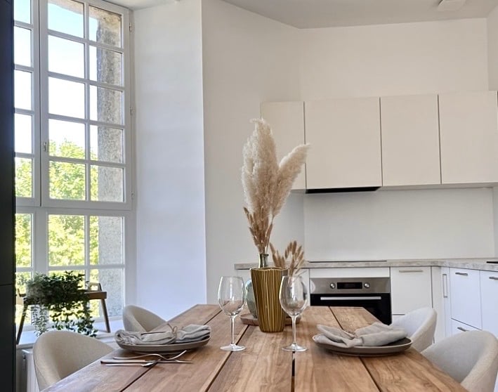 Le travail sur l'aménagement et les couleurs permet de rendre à la baie vitrée la place d'élément structurel majeur dans l'appartement. Un pilier obstruait la baie, nous l'avons habillé pour créer un élément complet de colonne de cuisine, pour que les éléments structurels fassent partie intégrante du projet. La cuisine a été traitée dans une laque blanche pour la rendre la plus discrète possible.