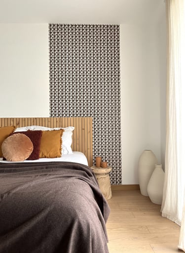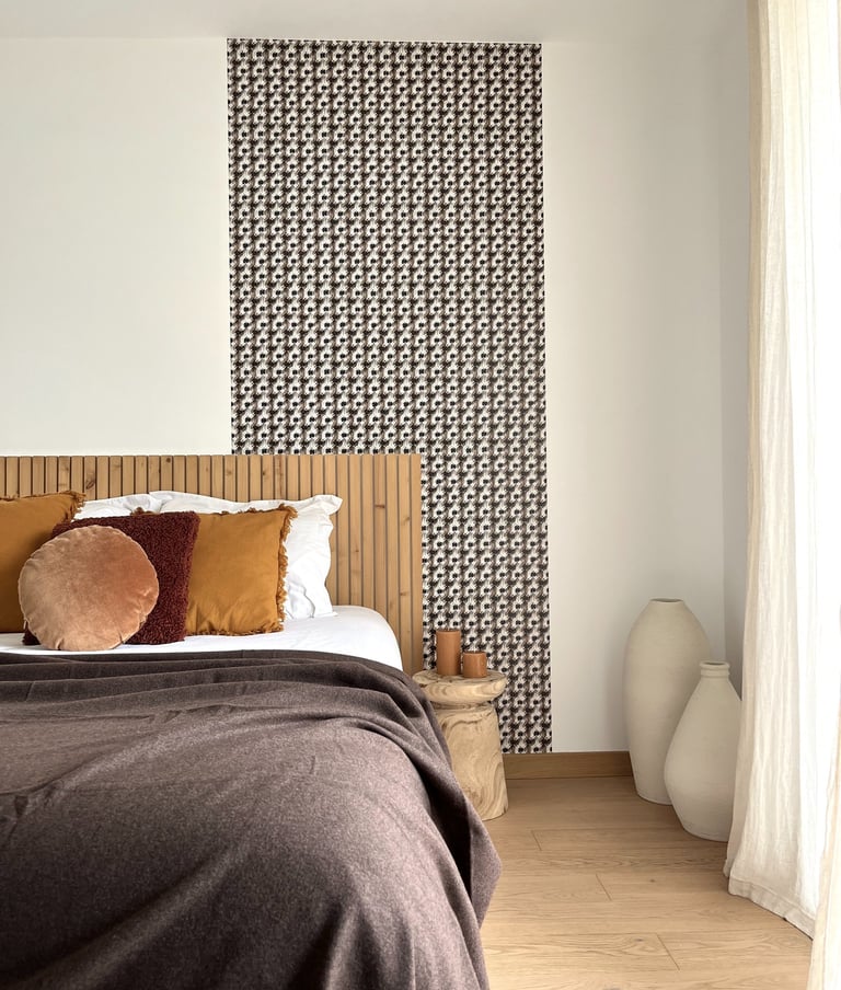 Un papier peint graphique dosé de manière subtile et une composition de textile pour une chambre conçue comme un cocon de douceur.