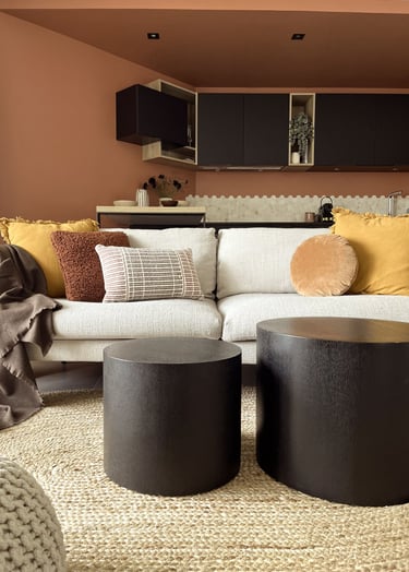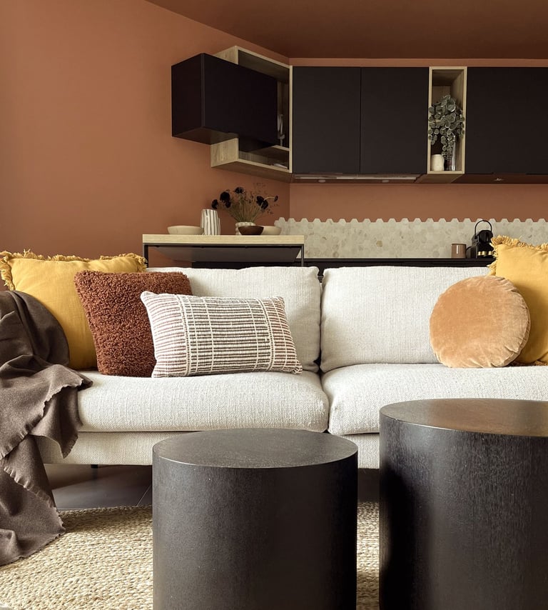 L'association de nuances chaudes et terreuses réchauffe l'ambiance intérieure et la sélection de mobilier tout en rondeur donne un aspect cosy à l'appartement.