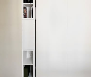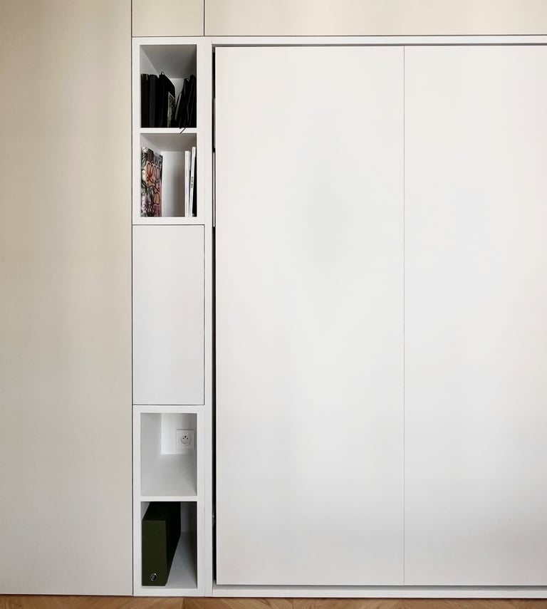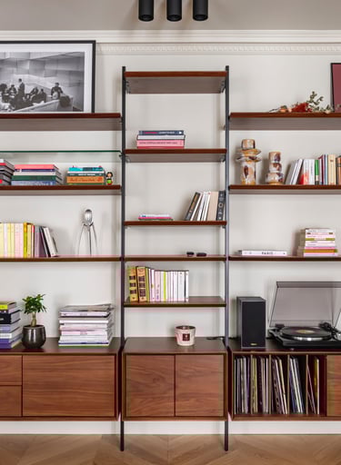 Une bibliothèque sur-mesure complète l’ensemble, conçue pour accueillir les lectures, les objets, les inspirations de Léa. Elle ancre sa personnalité dans le lieu, entre références artistiques, fragments de souvenirs et objets du quotidien. Le salon devient ainsi un espace de vie à part entière : à la fois ancré et mouvant, structuré mais vivant, précis sans jamais être figé.