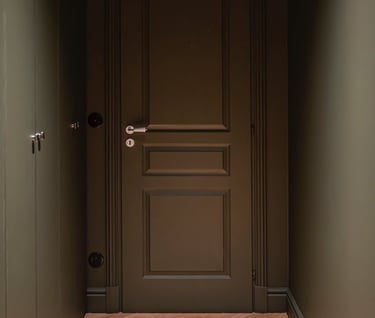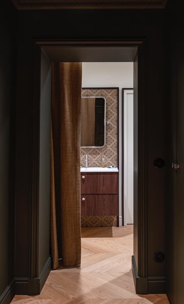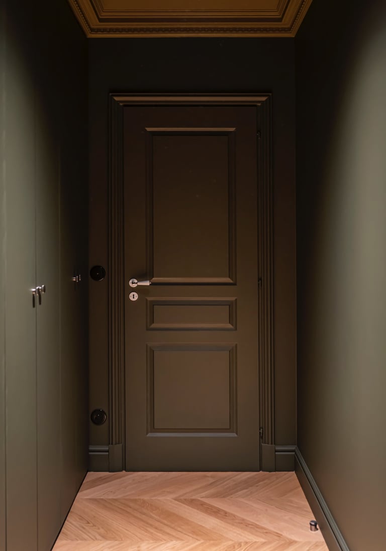 Plus loin, le couloir se creuse dans l’ombre. On choisit de ne pas le contrarier : au contraire, on accentue sa profondeur avec un vert intense et des touches de bronze.