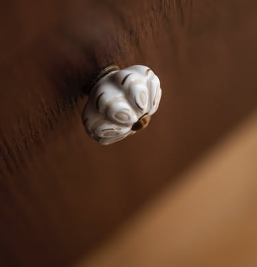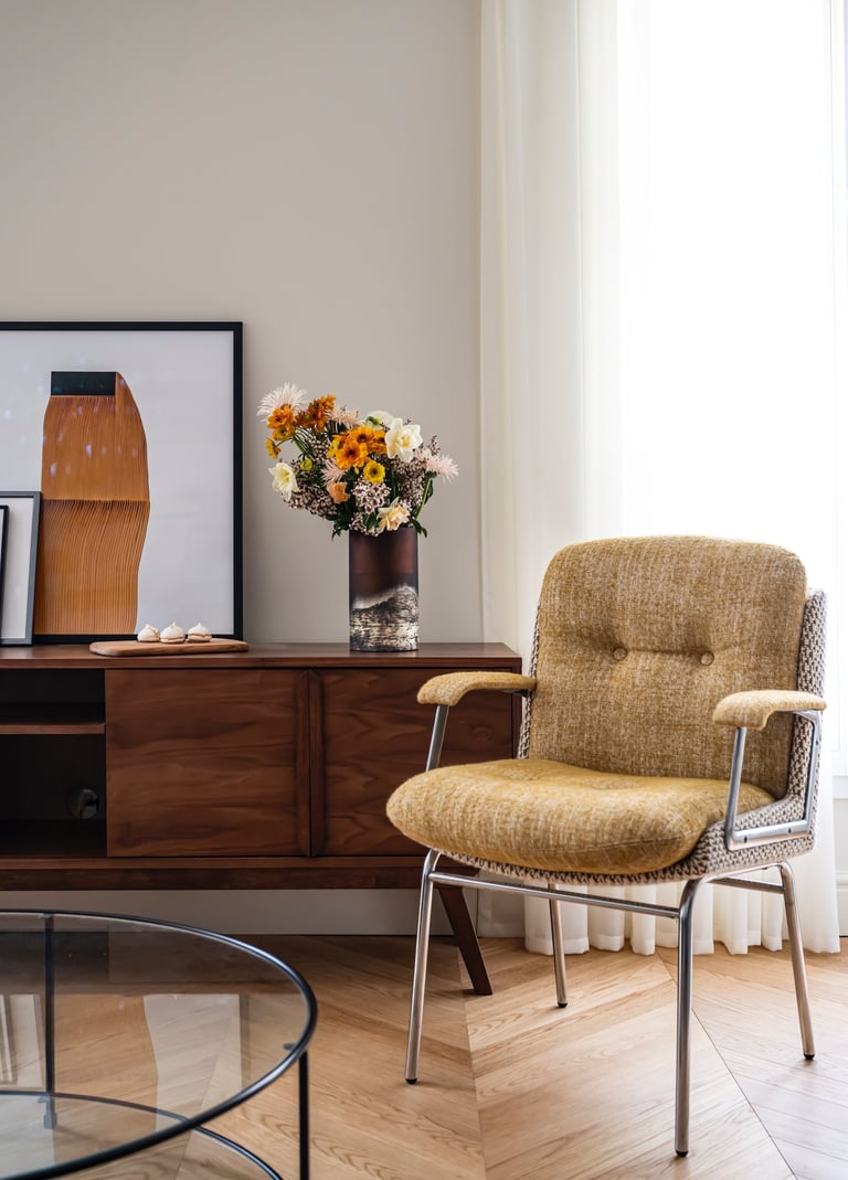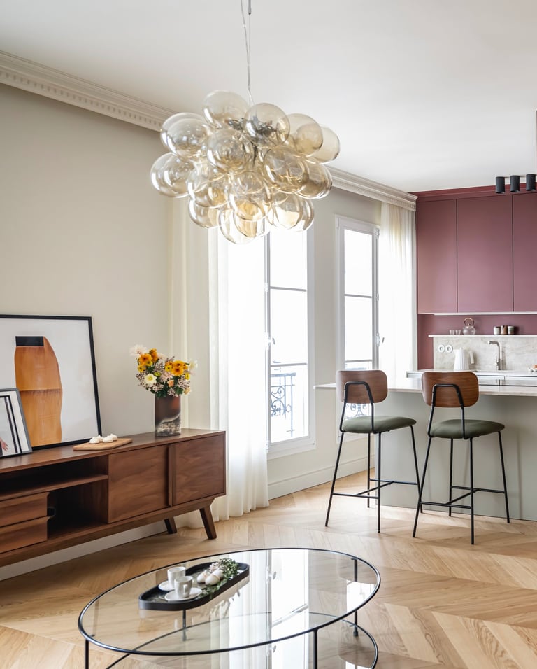 Le salon conserve ses volumes d’origine, volontairement laissés aérés pour respirer, mais il ne s’agit pas d’un vide neutre – au contraire, tout ici est geste mesuré, chaque élément posé pour révéler l’âme du lieu. Le parquet point de Hongrie trace une trame élégante au sol, apportant de la profondeur et un rythme naturel. Aux murs, les corniches, restaurées avec soin, redonnent au plafond une présence douce, presque graphique. Le mobilier a été chiné avec intention : des pièces choisies pour leur patine, leur dessin, leur histoire, qui contrastent subtilement avec les lignes plus discrètes du reste de l’espace.
