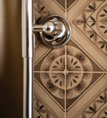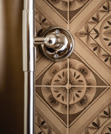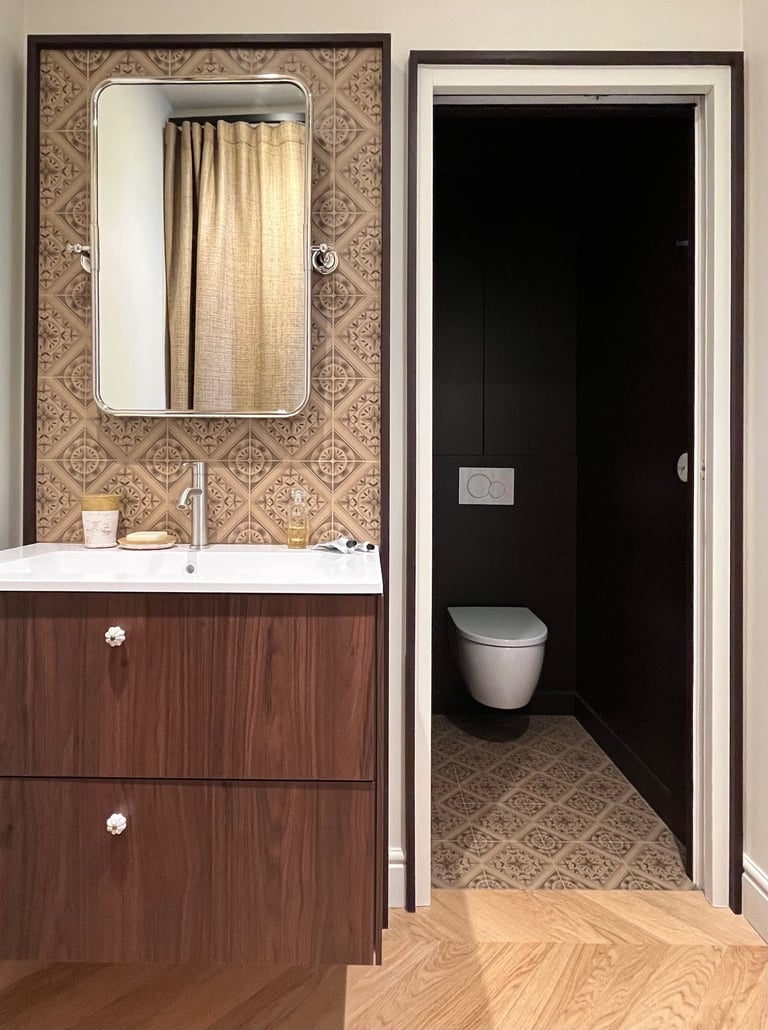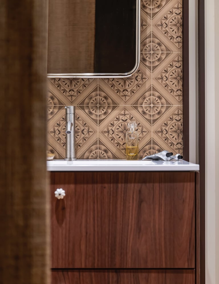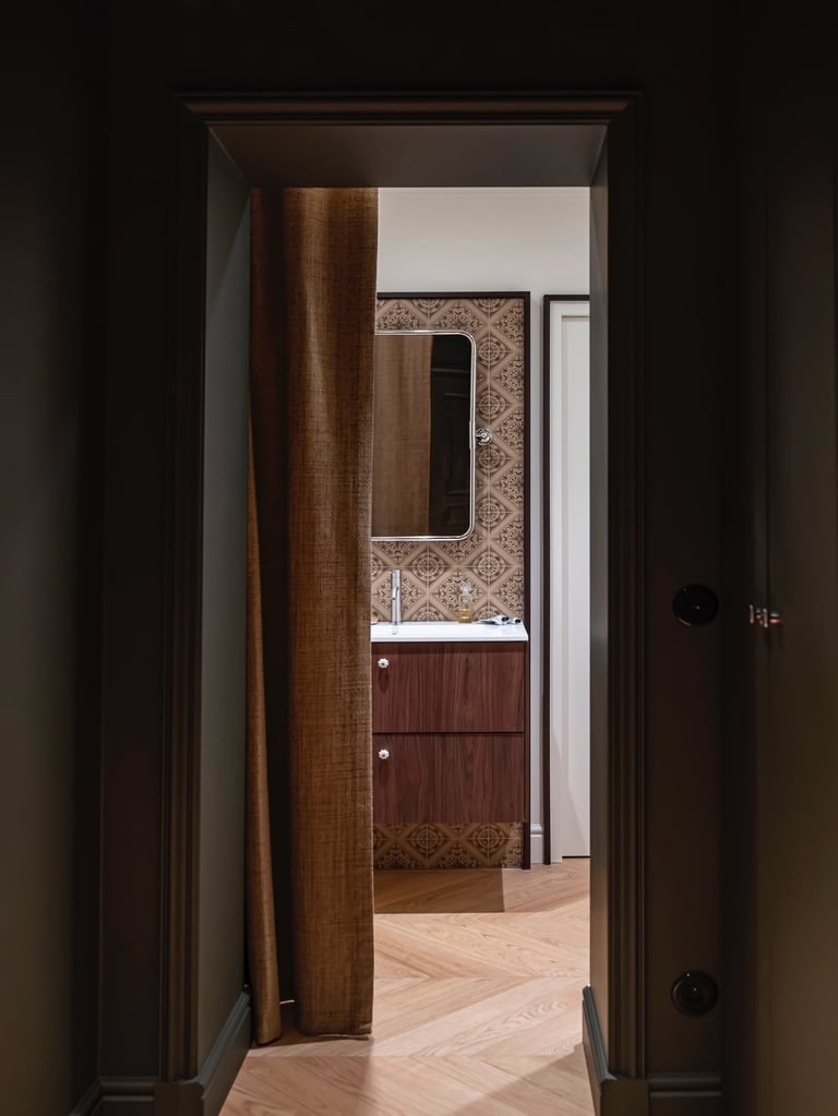 Cette atmosphère feutrée accompagne la transition vers la salle de bain, entièrement repensée, aux teintes terreuses et aux finitions inox qui lui donnent une allure doucement rétro. Le textile s’y glisse aussi, comme un fil rouge du projet.
