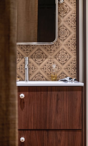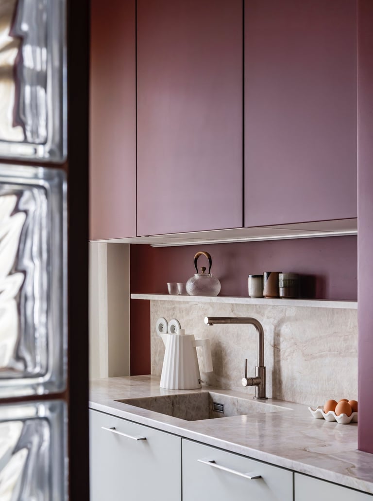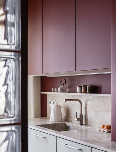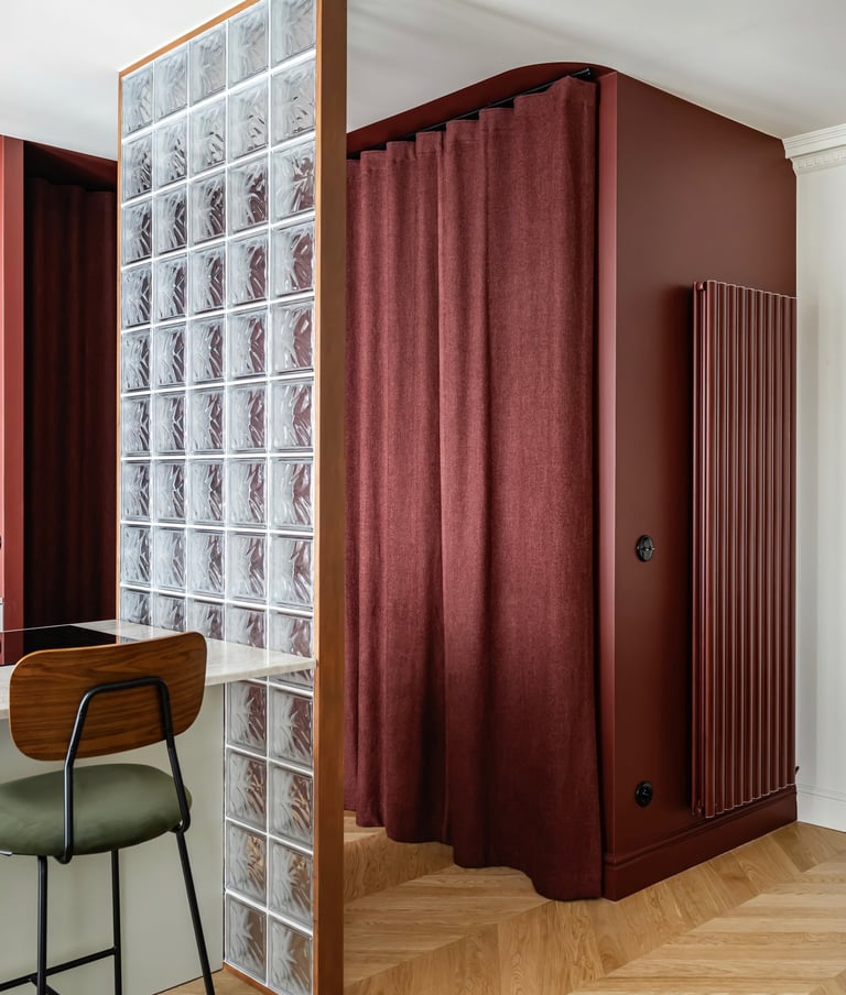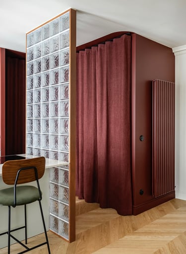 Dès l’entrée, une cloison en carreaux de verre laisse passer les rayons du jour, créant une première respiration visuelle. La circulation s’ouvre alors sur la cuisine, le séjour et un petit cellier, traités avec le même soin que le reste : tout commence ici. La teinte bordeaux vient rythmer l’espace, délimiter sans cloisonner. Elle dialogue avec un vert jade profond, choisi pour les meubles bas de la cuisine, et la douceur minérale de la pierre Taj Mahal. Jusqu’aux interrupteurs, en porcelaine, chaque détail s’accorde.