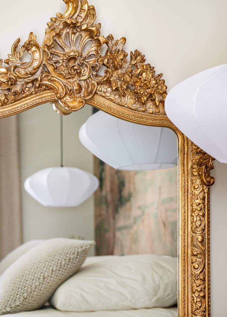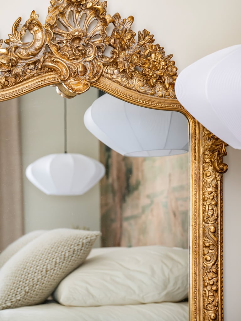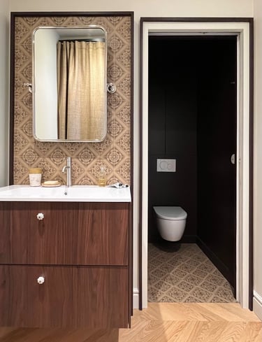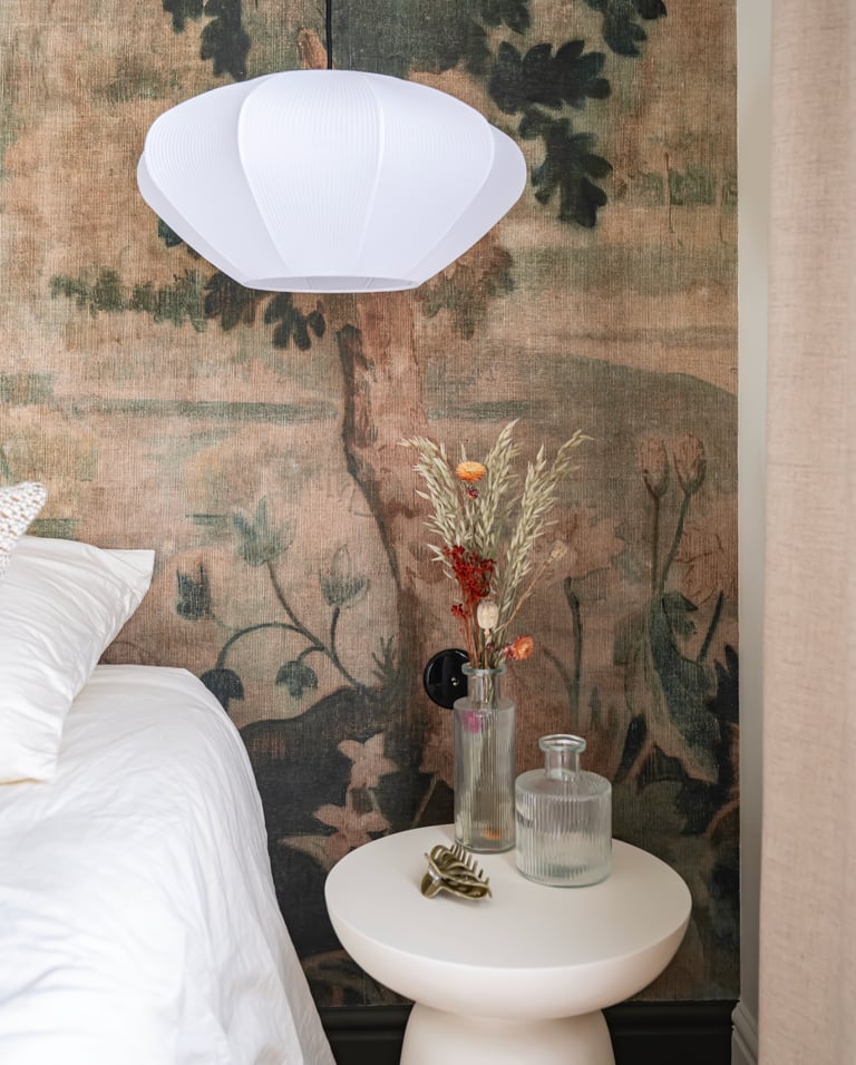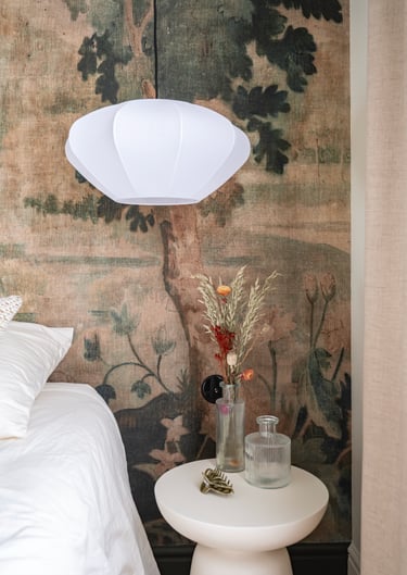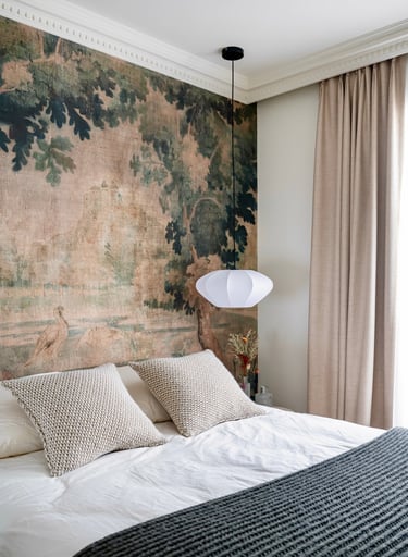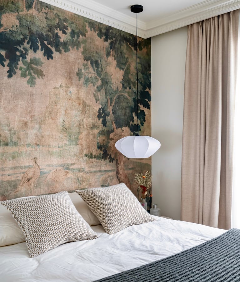 Attenante à la salle de bain, la chambre principale se construit en écho. Le papier peint Pierre Frey, choisi avec la cliente, a tout déclenché. Un motif coup de cœur, une palette raffinée : vert, bronze, mondoré. La nature entre, sans jamais s’imposer, comme une tapisserie ancienne qu’on aurait redécouverte.