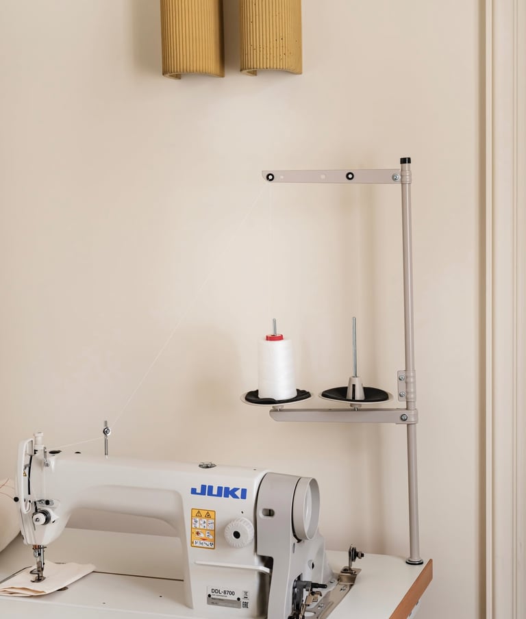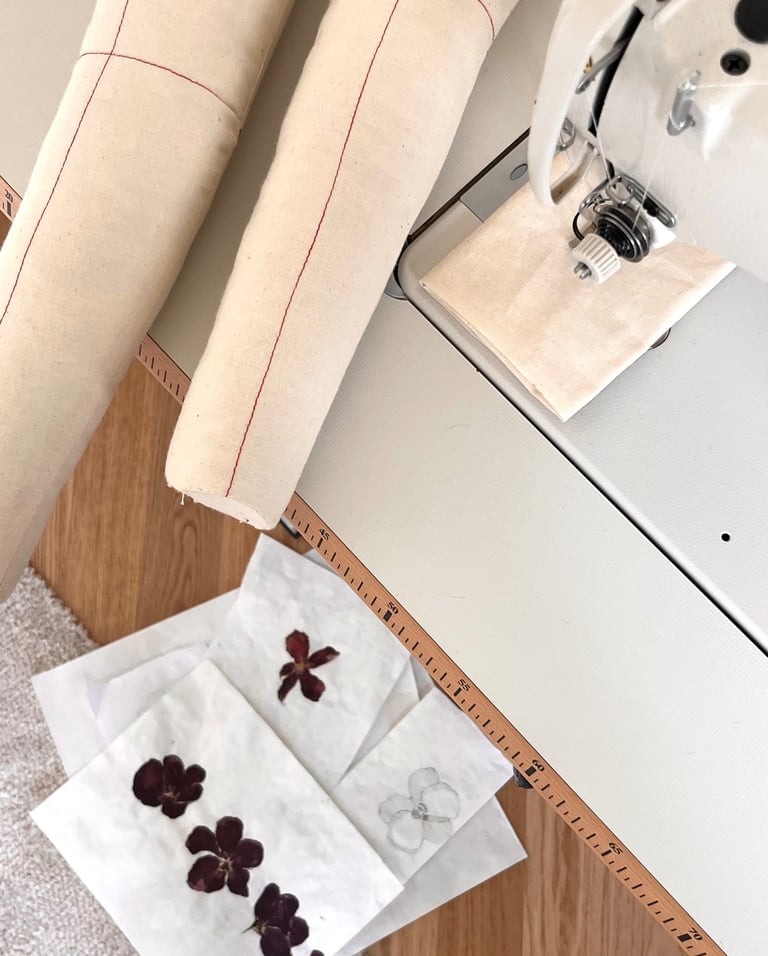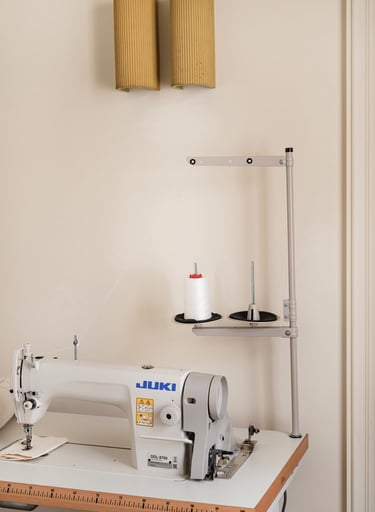 Sur la table, une machine à coudre attend les tissus à assembler, les patrons se déplient en silence, les pinceaux trempent dans l’eau claire. Au mur, quelques esquisses, des épingles, des bouts de toile accrochés à la volée racontent un processus en cours, une idée en train de naître.