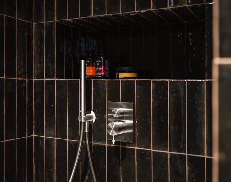 La douche et les WC sont discrètement dissimulés dans une “boîte” sombre, volontairement contrastée, comme un volume à part. Ce traitement permet de rythmer la pièce, tout en préservant une certaine élégance fonctionnelle. Le textile, encore une fois, n’est pas oublié : rideaux, linge, textures douces viennent compléter l’ensemble, avec toujours cette idée de confort discret, et de détail juste.