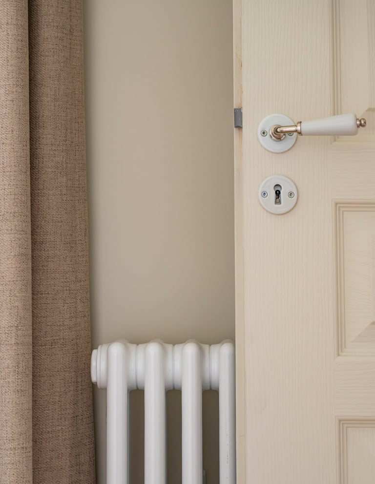 Les meubles hauts, eux, ont été traités dans la même teinte que les murs pour se fondre complètement et disparaître visuellement, créant une continuité paisible dans le regard.